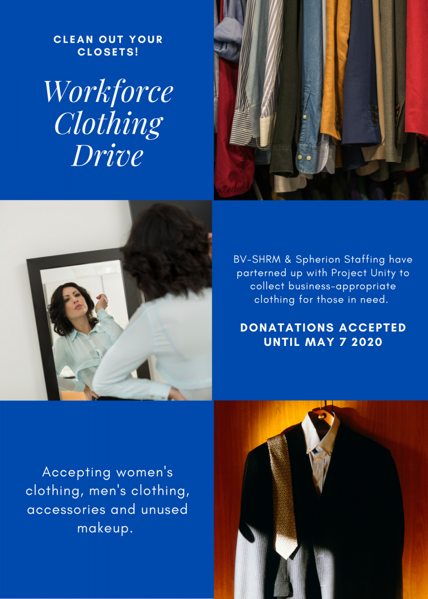 As some of y'all may know, BV-SHRM and Spherion Staffing - Bryan, Texas have partnered up with Project Unity to host a workforce clothing drive.