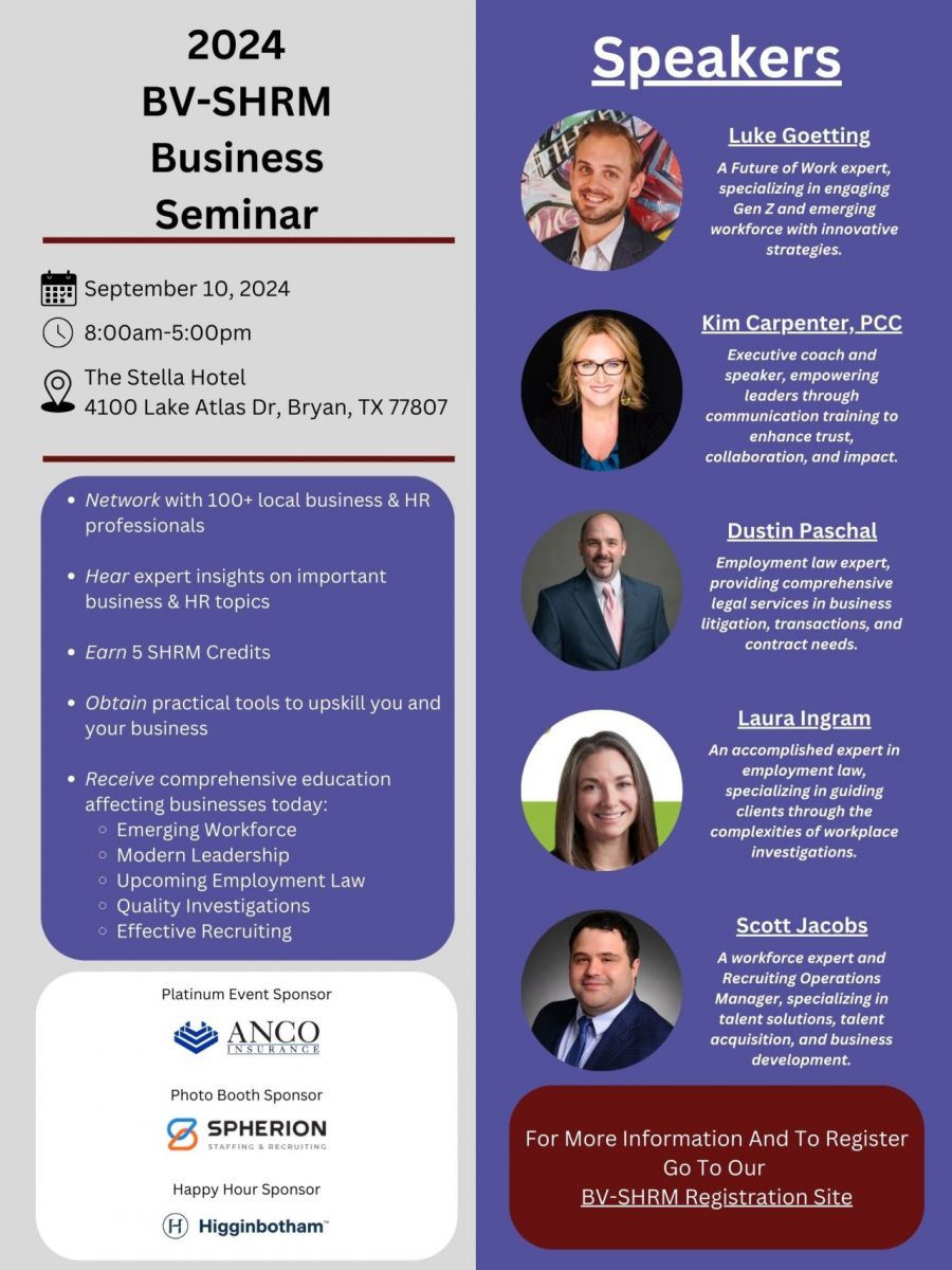 The 2024 BV-SHRM Business Seminar is designed with you in mind, offering a perfect blend of relevant HR topics, interactive workshops, and exceptional networking opportunities.